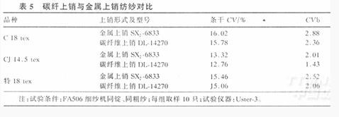 在實際生產(chǎn)中,我們對金屬上銷和碳纖上銷的使用情況進行了對比,發(fā)覺碳纖維上銷相對金屬上銷而言,其剛度、韌性較好,抗變形能力強,具有優(yōu)良的自張力功能,膠圈運轉穩(wěn)定,成紗質(zhì)量穩(wěn)定;碳纖維上銷的成紗質(zhì)量實在要優(yōu)于金屬上銷,其質(zhì)量對比情況見表5。