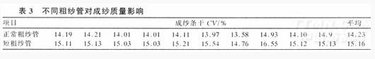 在生產(chǎn)實踐中,由于受粗紗機型或紡紗品種的限制,在紡同一品種時可能會使用不同機型、長短不一致的粗紗管或大小粗紗交叉混用。由于長短粗紗管所紡粗紗及大小粗紗管的退繞半徑不同,使其退繞張力不一致,從而造成細紗牽伸過程中握持力、牽仲力的不一致,導致影響成紗條干質(zhì)量;試驗數(shù)據(jù)見表3,