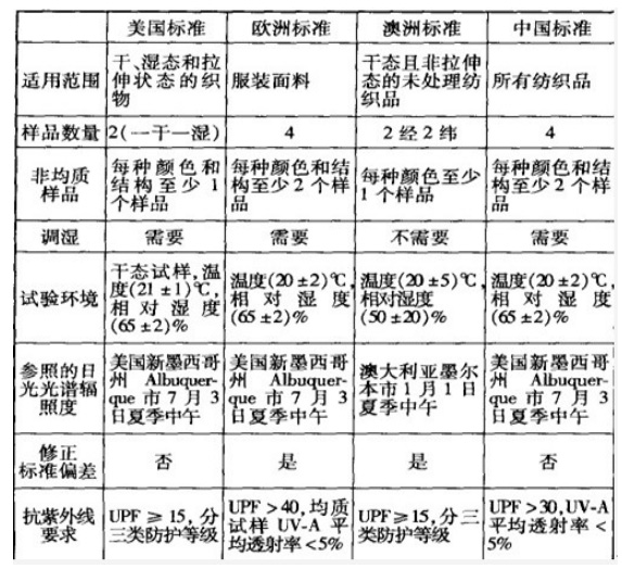 表2 各國防紫外線測試方法標(biāo)準(zhǔn)間的差異